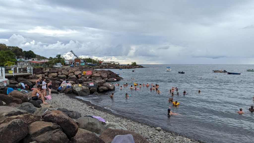 Nous repartons maintenant vers le Sud, direction Bouillante. Ici c’est comme à la réunion, le nom des villes est plutôt explicite. Issu du volcan, une rivière, un fleuve techniquement, d’eau bouillante vient se jeter dans la mer. Une centrale géothermique profite de cette énergie. Puis il est possible de se baigner dans la mer depuis une petite plage de galets. L’eau y est alors très chaude. Il est interdit bien-sûr de remonter le fleuve car c’est bien trop chaud. Et même dans l’axe direct c’est encore très chaud. Mais en se plaçant à la limite, nous profitons d’une eau aux alentours de 40°c. C’est un véritable bain dans la mer. C’est très original et agréable. Nous y passons un bon bout de temps.