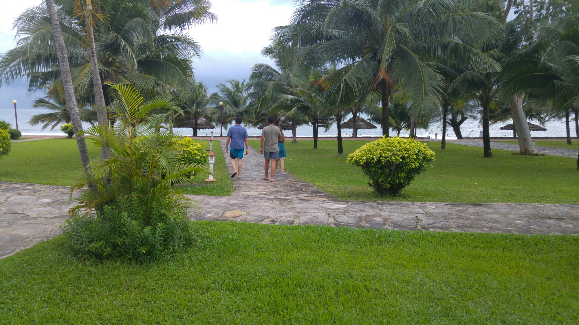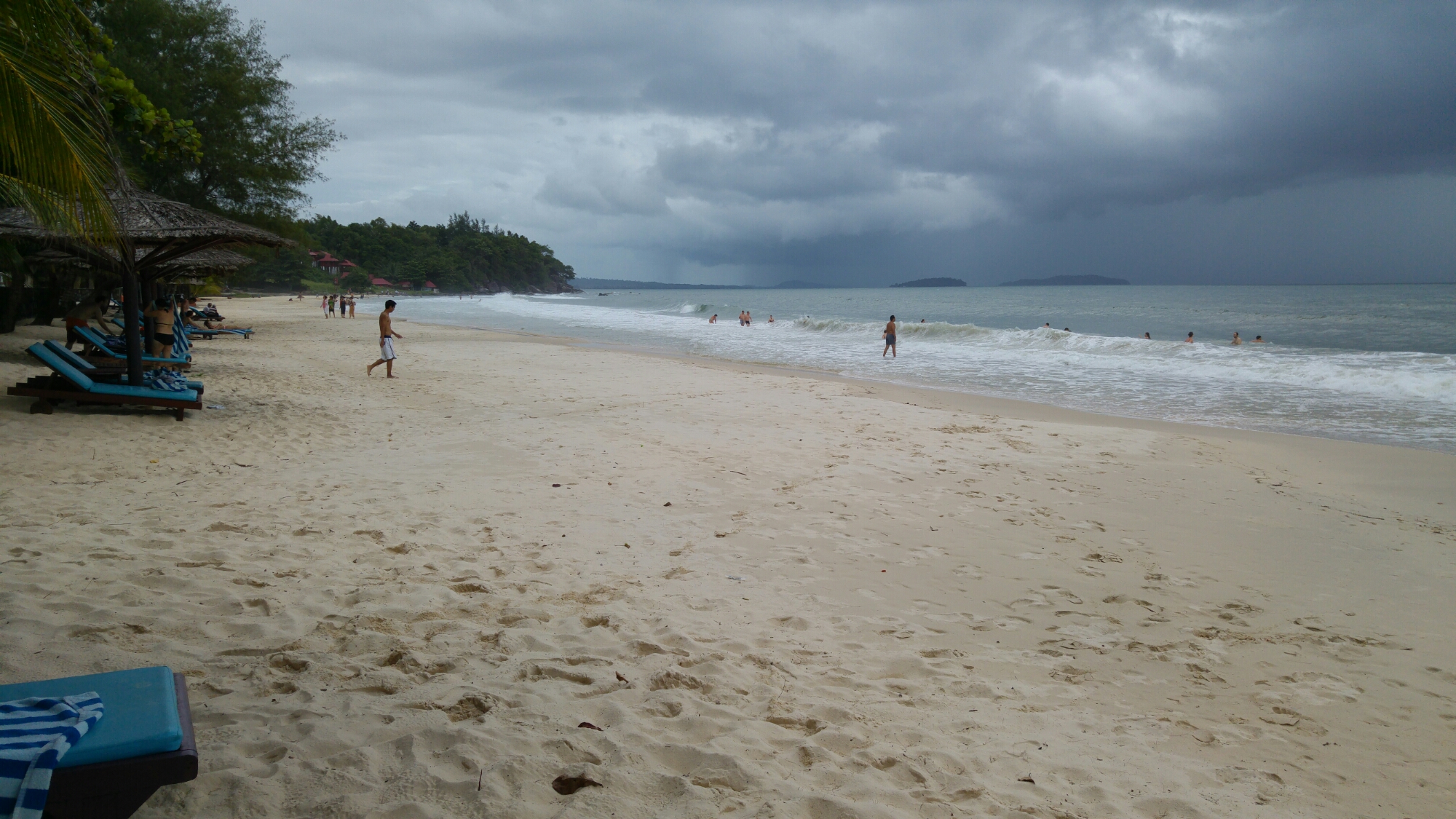 Nous voilà arrivés pour la dernière étape du voyage. Au Sud Ouest du Cambodge, au bord du golfe de Thaïlande, nous dormons à Sihanouk. L’hôtel est un gros complexe balnéaire. Nous avons une immense plage privée en plus d’une grande piscine. On a réussi a arrivé relativement tôt, vers 16h, poir profiter de Sokha beach. Par contre là, on se tape le temps de la saison des pluies. La mer est agitée. Mais ça à la rigueur c’est drôle. Par contre elle est trouble, mais loin d’être froide donc ça va. Et on se tape des grosses averses. Mais bon, je préfère ça ici qu’à Angkor.