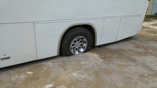 C’est la loi du plus gros sur la route. Le chauffeur ne freine jamais, il double. Sauf si c’est un camion en face. Pour les voitures il fait un peu attention … Il klaxonne. Les motos et les tuk-tuk par contre … Allez voir dans le bas côté si on y est.
