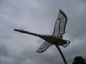 Aujourd’hui nous n’avions pas d’activité précise de programmée. Nous devions « juste » rejoindre Sault Sainte Marie (560km sans détour). Nous avons donc pris le temps de nous rendre dans le centre de Midland pour prendre un petit déjeuner. La ville est quadrillée de large rue, à l’américaine. Nous avons quand même pu trouver à boire un vrai café et non leur jus de chaussette bouillant. Nous avons ensuite profité d’un Subway pour avaler un pancake au bacon. Petite balade sur le port. Là, une sculpture de canard géant rend homage aux donateurs de la ville o_O … bon, il est temps de partir.