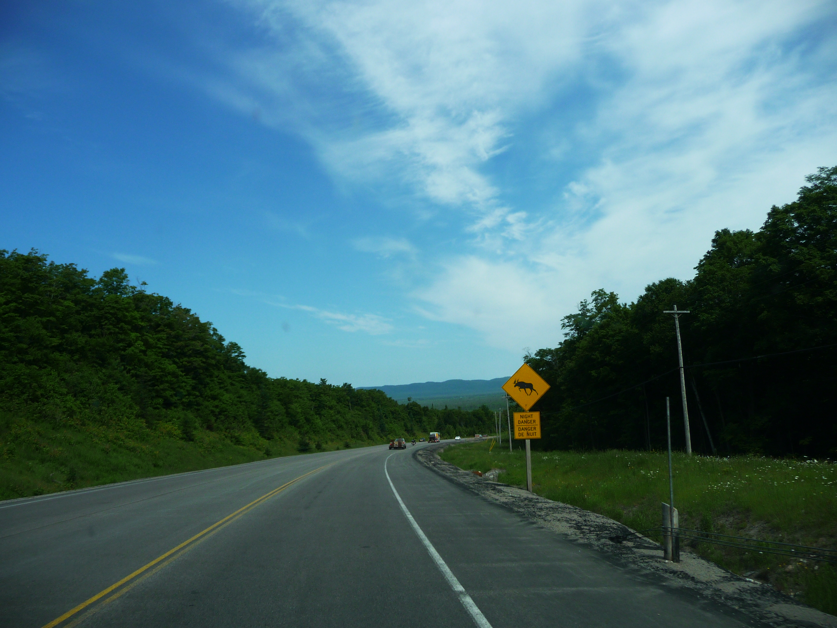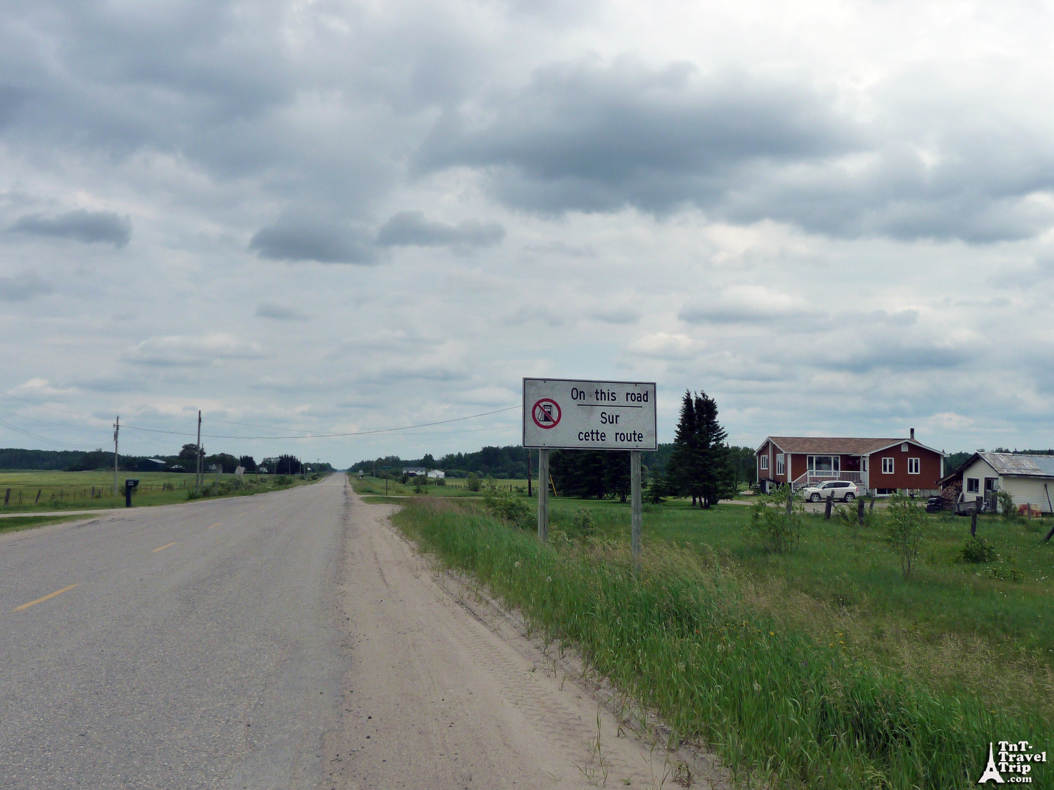 On part donc direction le centre ville pour le petit dej’. Bon, et bien en fait c’est vraiment tout petit, il n’y a rien et le peu qu’il y a est fermé (et oui, nous sommes le 1 Juillet, c’est la fête national). Tant pis pour le petit dej’, nous reprenons la route. En ce jour de fête national c’est traditionellement le jour des déménagements au Canada. C’est aussi le début d’un weekend de 4 jours et des vacances scolaires. Il y a un fort risque que l’on croise du monde sur la route. Oui mais pas celle là, c’est le moins que l’on puisse dire. Il n’y a pas un chat, la route est déserte.