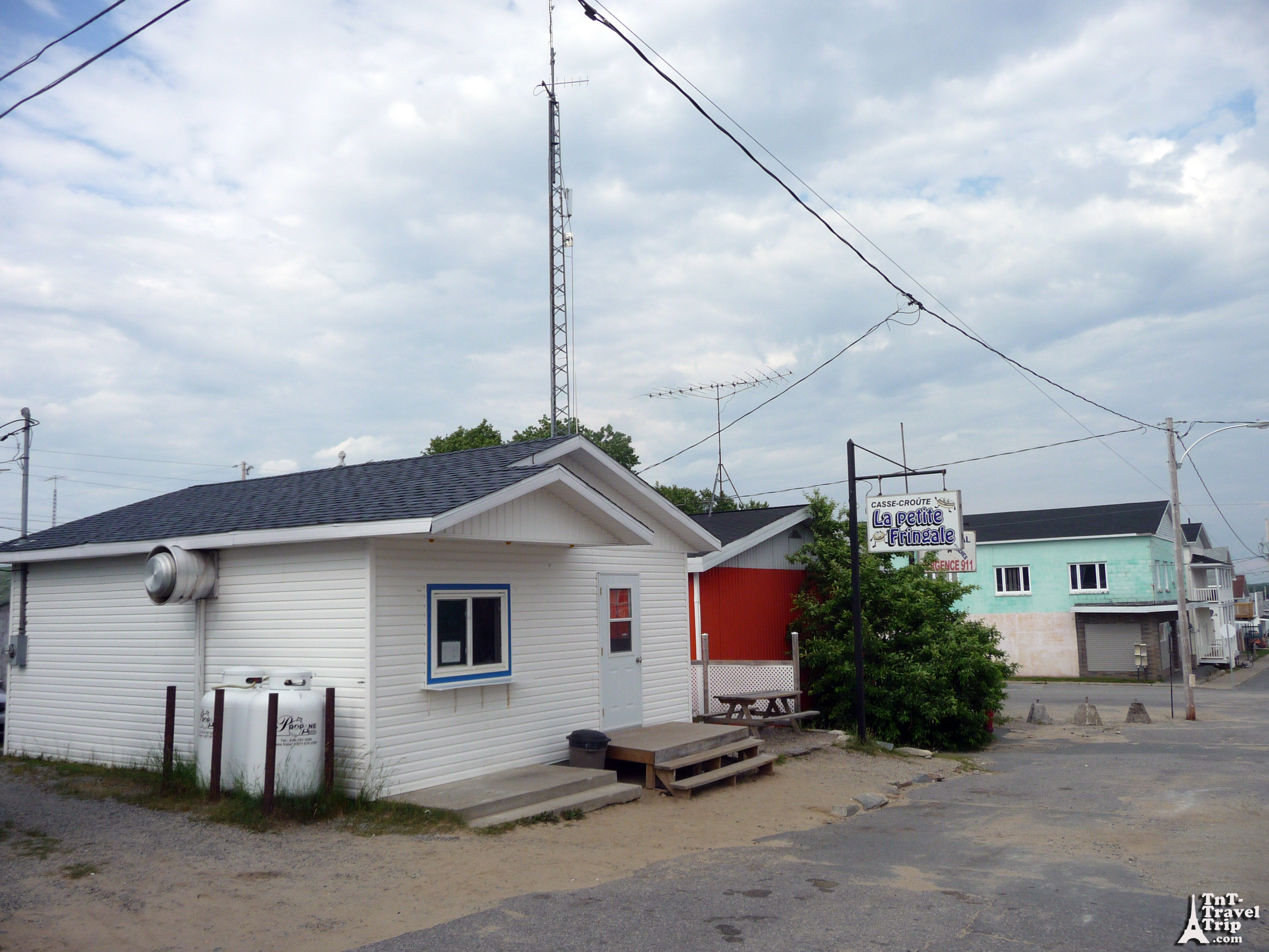 En raison de travaux sur le seul pont de la « ville », nous sommes déviés sur Normétal. N’ayant pas mangé depuis les donuts de ce matin, nous avons une petite faim. On tombe par hasard sur une petite baraque « la petite fringuale ». On rentre donc sans grande conviction et tombons sur une petite affaire familiale avec une salle de 5m² à tout péter. La dame, ne nous reconnaissant pas, nous demande si nous sommes du coin. Oui, pas tout à fait en fait. On lui indique donc que nous sommes français nous autres là. Elle était alors super contente de nous voir. Et nous propose de manger de la poutine (une spécialité locale à base de frite et de fromage). On a jamais vu un tel accueil, toute la famille s’y est mise, la fille en cuisine est venu nous voir puis le mari est venu discuter avec nous. Je pense qu’il n’en on pas vu beaucoup des français dans leur patelin. C’était l’événement de l’année. On leur explique notre périple et le type nous explique donc la route pour partir. Il nous explique également que la route que nous avons prise est une route privée de la société qui exploite la forêt et qu’elle n’est donc pas sur la carte. Après notre repas (la poutine c’est pas mauvais mais ça tient chaud, c’est un peu comme bouffer de la tartiflette au soleil en été) la dame nous prie de bien vouloir remplir le livre d’or puis s’excuse de vouloir nous serrer la main. On était comme des stars. Ça fait pas 20 minutes que nous sommes au Québec que nous avons rencontrés les gens les plus chaleureux du monde, et on a mangé de la poutine :p C’était vraiment incroyable, c’est là tout l’intérêt d’un road trip, on va de surprise en surprise.