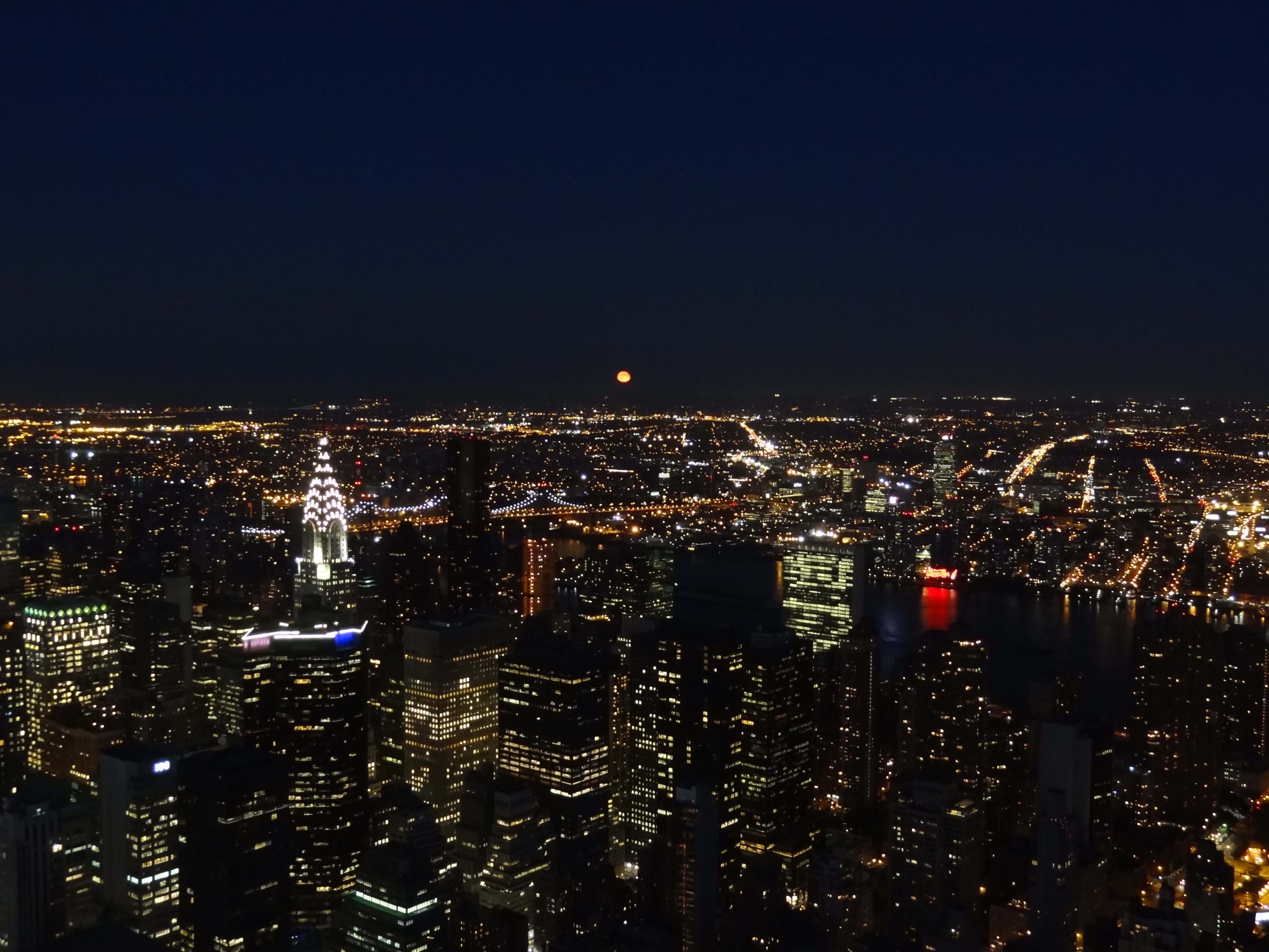 La lune rouge derrière le Chrysler Building et les Nations Unis