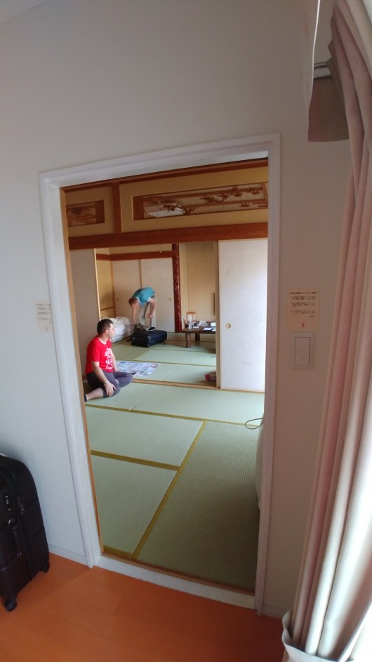 Pour ce premier jour nous sommes donc à Fukuoka, chef lieu de l’île de Kyushu. Il fait chaud ! Très chaud et très humide ! Première étape, trouver l’hôtel. Nous ne prenons la voiture que demain. Bon après s’être fait expliquer comment prendre le bus, on découvre qu’il faut l’attendre 1 heure … Bon du coup on a pris le taxi avec les valises sur les genoux.