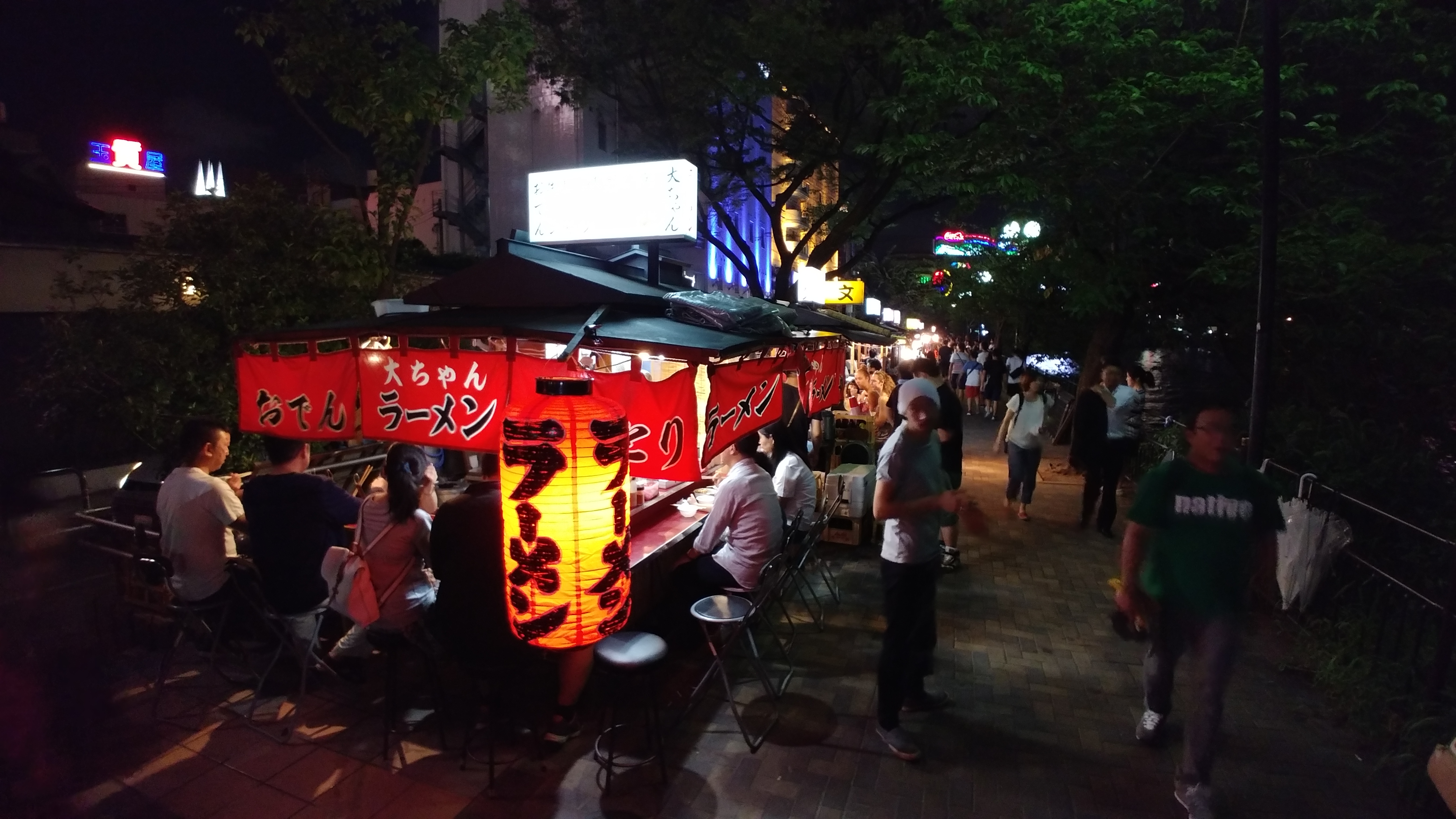 Et enfin, un repas rapide dans les fameux Yatai de Fukuoka. Ce sont des petites roulotes qui arrivent le soir et se transforment en mini restaurant de 8 à 10 places. La street food est très populaire ici au bord de la rivière.