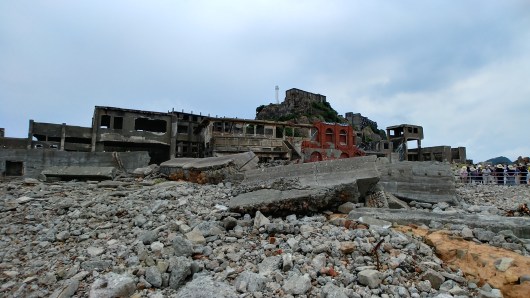 Après la découverte d’une forte concentration de houille, l’île est achetée par Mitsubishi en 1890. En pleine révolution industrielle, l’entreprise commence à construire la mine puis petit à petit, tout le nécessaire pour héberger les ouvriers sur l’île. L’île va alors être considérablement agrandie artificiellement. Elle accueillera la plus forte densité de population du monde (non dépassé depuis) avec 5500 personnes sur cette petite île.
