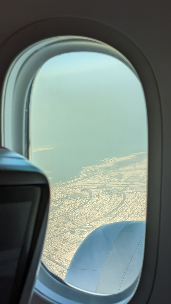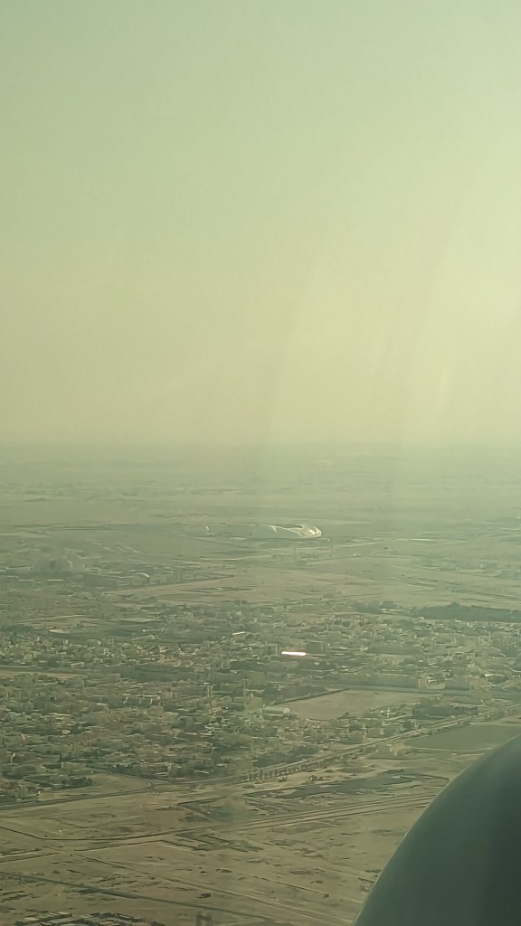 Après l’aventure d’hier soir pour arriver à notre hôtel, nous décidons de nous lever encore une heure plus tôt pour prendre notre avion. Nous faisons alors partie des premiers au petit-déjeuner. D’habitude c’est plutôt l’inverse 😂. Mais nous avons bien fait, car ce sera bien le même cirque pour retourner au terminal 1. Cette fois la bretelle n’est plus en travaux, mais le bus passe par les parkings pour prendre du monde. Nous arrivons tout de même avec nos 3 heures d’avance habituelles. Mais elles ne sont pas de trop. Nous mettons un temps infini pour passer la frontière. Mais bon, nous voilà dans notre avion. Comme pour l’aller, nous faisons escale à Doha. L’occasion de faire le tour des stades de la coupe du monde vu du ciel.