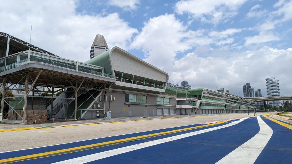 Le grand prix de Singapour est, à l’instar de Monaco, une course urbaine. En dehors du week-end de l’événement, le circuit est donc démonté. On peut deviner le tracé en ville par la présence de quelques vibreurs dans certains virages. Le circuit profite également d’une tribune permanente devant la baie. Mais elle n’est pas à cet usage exclusif. En revanche, ce qui le caractérise et reste accessible toute l’année, c’est le Pit Building face à la grille de départ, ou le « bâtiment du puits » diraient les canadiens 😋. Par contre ce qui choque, c’est que même ici où de toute façon ça ne gène personne, absolument tout est démonté. Même les grilles entre la piste et les stands, les tribunes en face du bâtiment, le podium, tout.