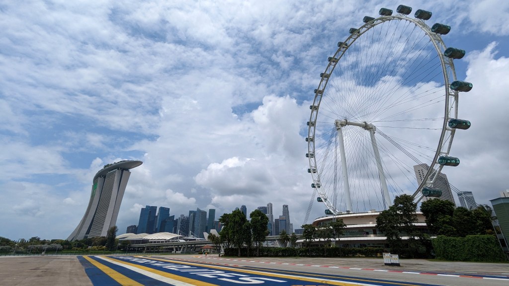 Nous avons encore quelques heures devant nous avant de reprendre l’avion. Les amis avec qui nous avons passé la soirée d’hier nous ont confirmés que nous pouvions nous rendre sur la grille de départ du grand prix de F1. Ce n’est pas fermé quand il n’y a pas d’évènement. 51 semaines par an donc 😋. Alors c’est parti. Nous reprenons le métro et direction la baie de Singapour. Le Pit building se trouve au pied de la grande roue « Singapore Flyer ». Comme les tribunes font face à la mer, nous arrivons dos à elles. C’est plutôt désert comme lieu. Mais il y a quand même un garage ouvert avec des gens qui bricole des motos. Et en amont des garages, un homme est assis à son bureau, dehors. Oui il a mis son bureau dehors et fait je ne sais quoi. Je remarque qu’il y a une chaîne au bout de la route ce qui ferme symboliquement l’accès au circuit.